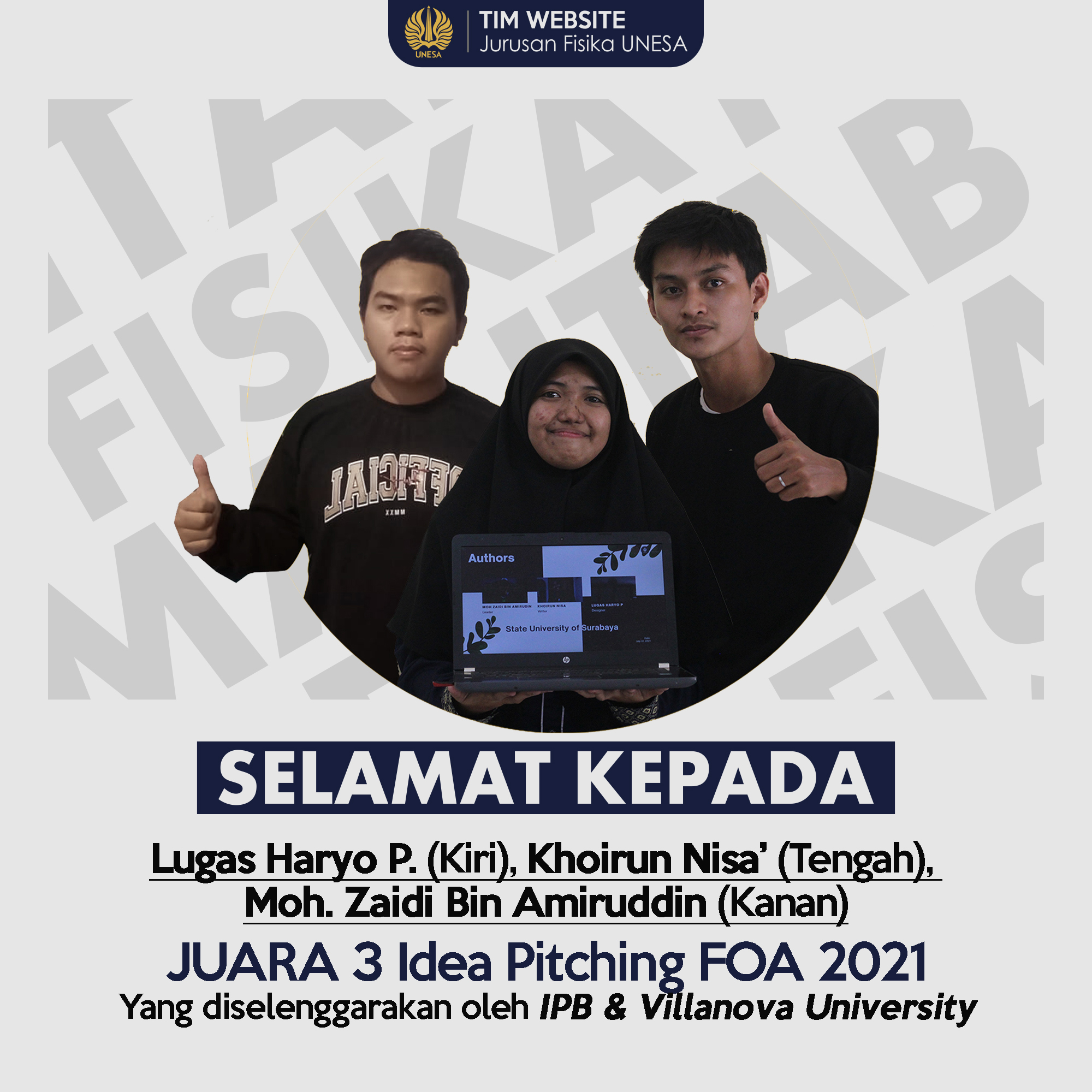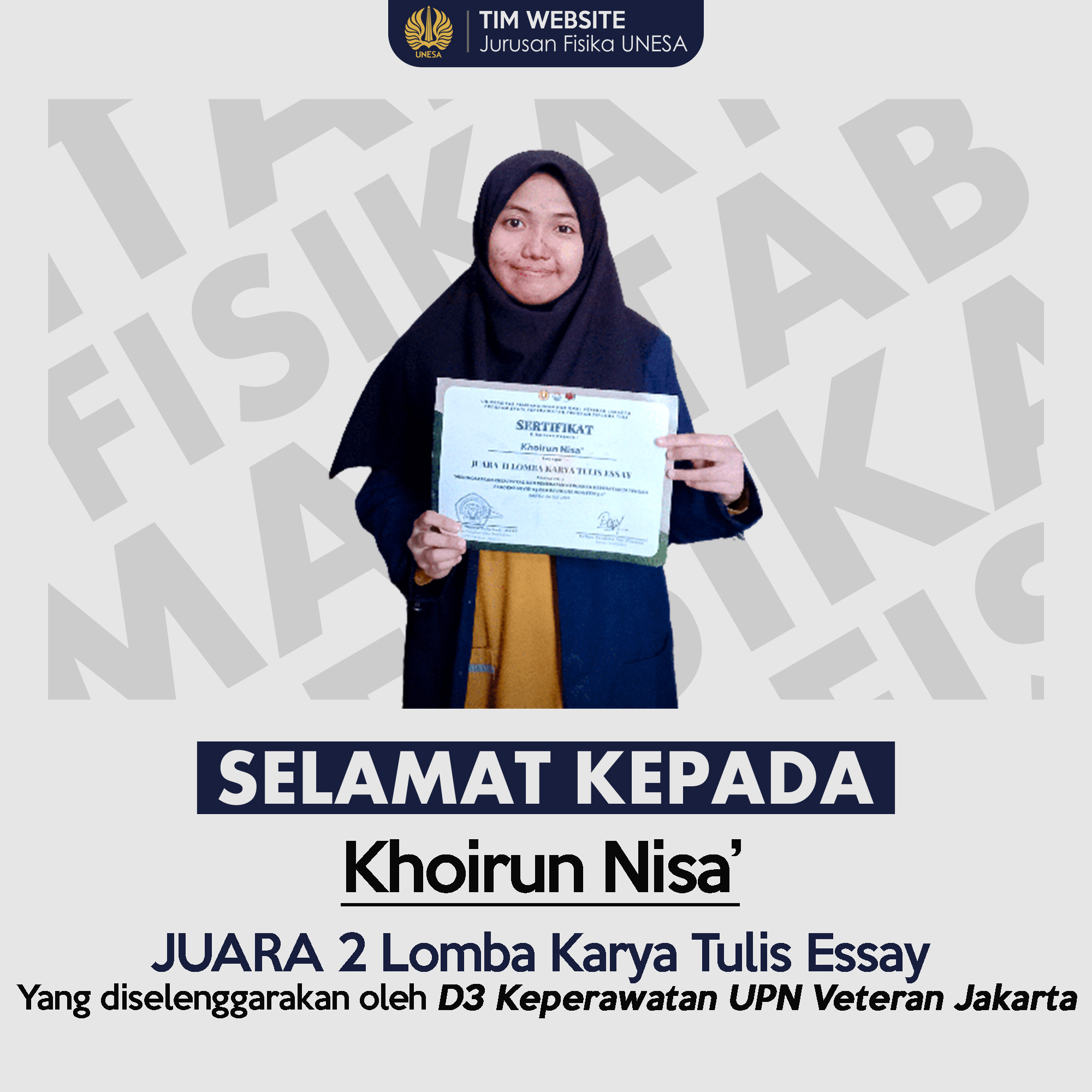 Khoirun Nisa’ (red: Nisa’), Mahasiswa Jurusan Fisika Unesa berhasil menjadi Juara