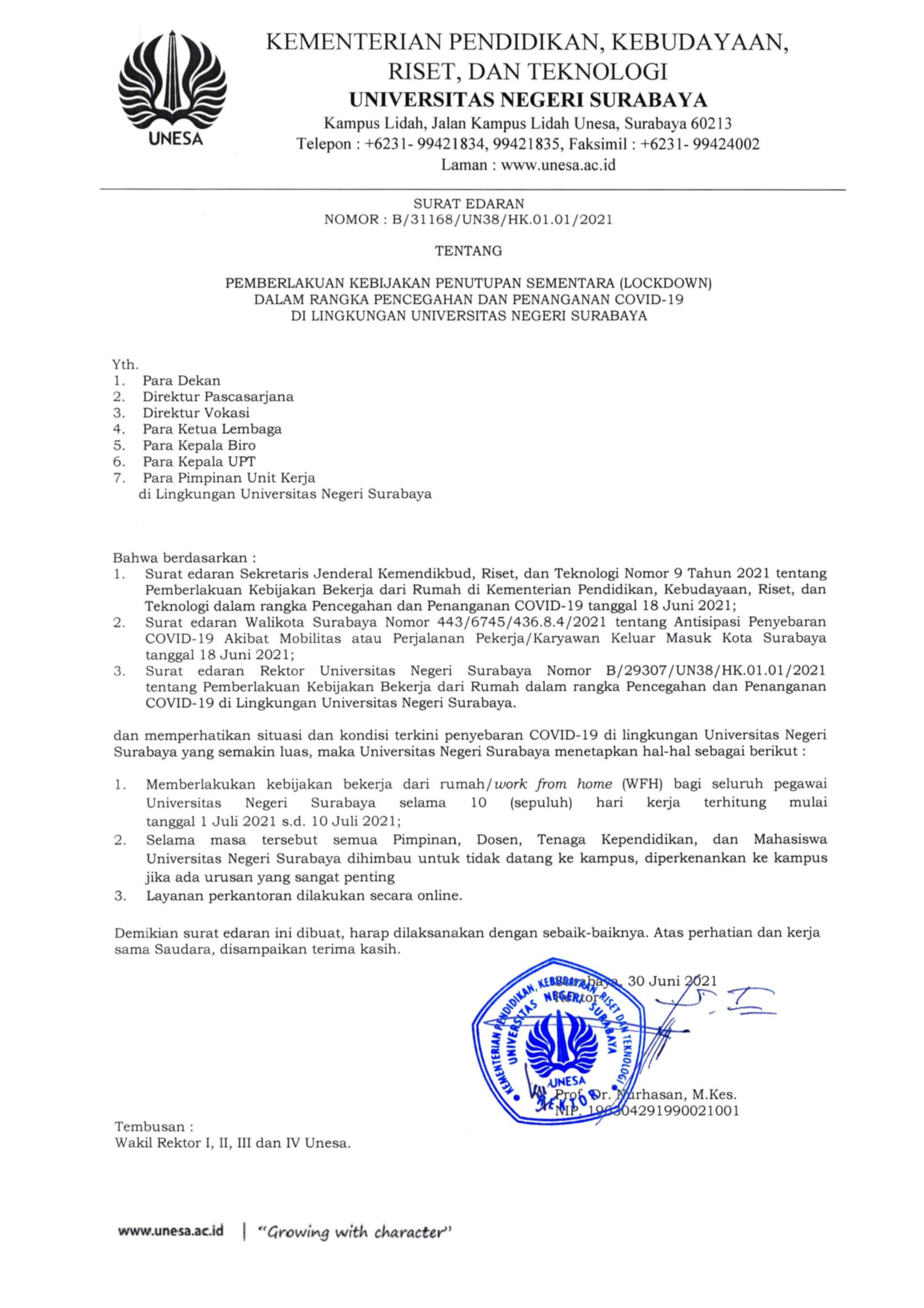 Implementation of a temporary closure policy (Lockdown) in the context of preventing and handling COVID-19 at the State University of Surabaya. The full file related to SE WFH June - July 2021 can be seen